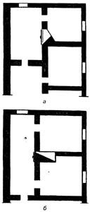 рис. 1, Установка угловой /а/ и прямоугольной /б/ печей, отапливающих три комнаты.