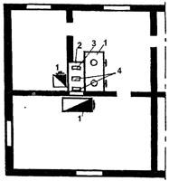 Вариант размещения печи для отопления четырех комнат показан на рис. 2 ( "Установка одной печи для отапливания четырех комнат" ) . Такая печь имеет большие размеры и занимает много места. Кроме того, ее стенки выделяют тепло пропорционально потерям каждой комнаты. В этом случае две комнаты проходные. В деревянных зданиях выбор мест установки печей ограничен. Там приходится применять насадные трубы. Печи с насадными трубами удобно размещать в любом месте, но следует предусмотреть, чтобы труба не попадала на балку перекрытия и стропила. Насадные трубы ставят только на массивных толстостенных печах. Тонкостенные печи в целях противопожарной безопасности не рекомендуется строить с насадными трубами.