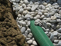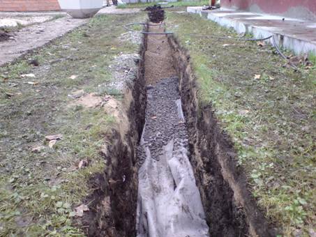 Рытье траншеи осуществляется первым делом. В зависимости от типа фундамента её глубина может варьироваться от 0,8 до 3,5 м. Ширина её основания должна составлять 0,5 м. Слой гравия толщиной 10 см обычно насыпается на дно этой траншеи. Особое внимание нужно обратить на используемый для засыпки гравий. 5-20 мм такой величины должна быть зернистость гравия, используемого при создании дренажа. Именно на эту созданную из гравия подушку и выполняется укладка дренажной трубы. Она укладывается с небольшим уклоном в сторону нижней точки. Для засыпки сверху используется щебень. Для того, чтобы осуществить разделение в дренажной системе между собой щебень и песок, можно использовать геотекстильный фильтр.